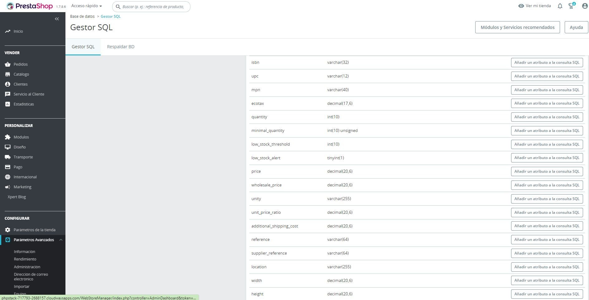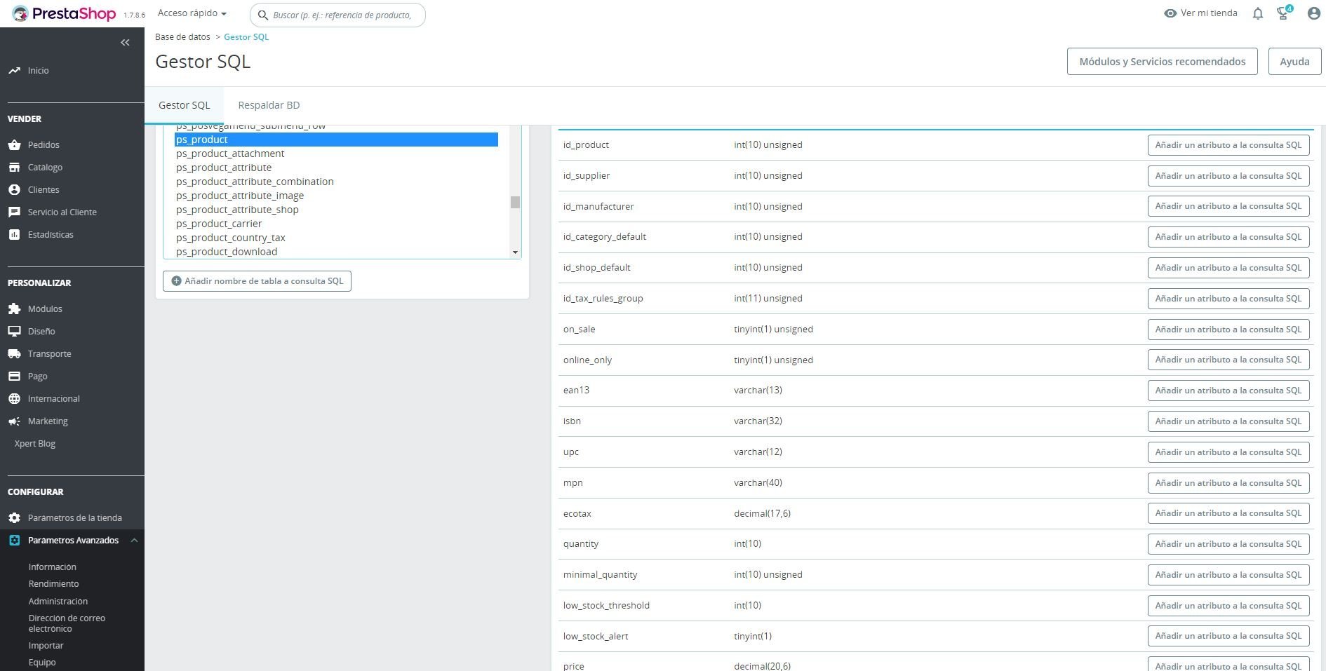 [email protected] Posted August 9, 2022 Share Posted August 9, 2022 Buenas, como ya te indicaron, pon la web en mantenimiento (ahora mismo está online) y pon tu ip para poder hacer las pruebas. Por otro lado en la primera imagen que posteaste, en la pestaña precio que tienes puesto? Abajo en esa pestaña te aparece Precio Específico, te sale algo? Por otro lado, entra en la base de datos y haz la siguiente consulta (supongo que las tablas comienzan por "ps_" si no es así cambia el prefijo en la consulta) SELECT * FROM ps_specific_price LIMIT 0,10 y si sale algún resultado yo empezaría por esta tabla. Si no sabes como entrar en la base de datos desde prestashop: Parametros avanzados -> Base de datos: Añadir Nueva Consulta SQL -> Dale el nombre que quieras y en Consulta SQL pega la consulta que te puse. -> Guardar Ahora dale al icono de la nuve con la flecha para abajo y te descargará el resultado de la consulta. Si el CSV tiene datos podría ser el problema de los 0.00€ Un saludo. Link to comment Share on other sites More sharing options...