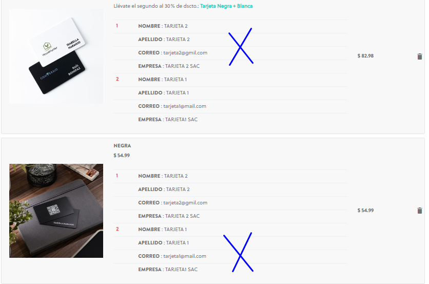 Alexander WK Posted August 10, 2022 Share Posted August 10, 2022 Hola a todos los miembros de la comunidad saludos, tengo un pequeño problema adjunto las imágenes. Resulta que cuando agrego un producto desde la ficha con una combinación X en el carrito de compras se muestra bien, pero cuando vuelvo a elegir otro combinación para el mismo producto esta personalización de alguna manera por ser el mismo producto me une la personalización lo que quiero es que no se repita esto (Cabe destacar que cuando finalizo el pedido desde administración se muestra correctamente el mismo producto con su combinación correspondiente y personalización). Para este ejemplo Tarjeta 1 debe salir en el ITEM 1 y Tarjeta 2 en el correspondiente.Alguna sugerencia para que no pase esto? ya que puede tender a confundir al cliente final muchas gracias Link to comment Share on other sites More sharing options...