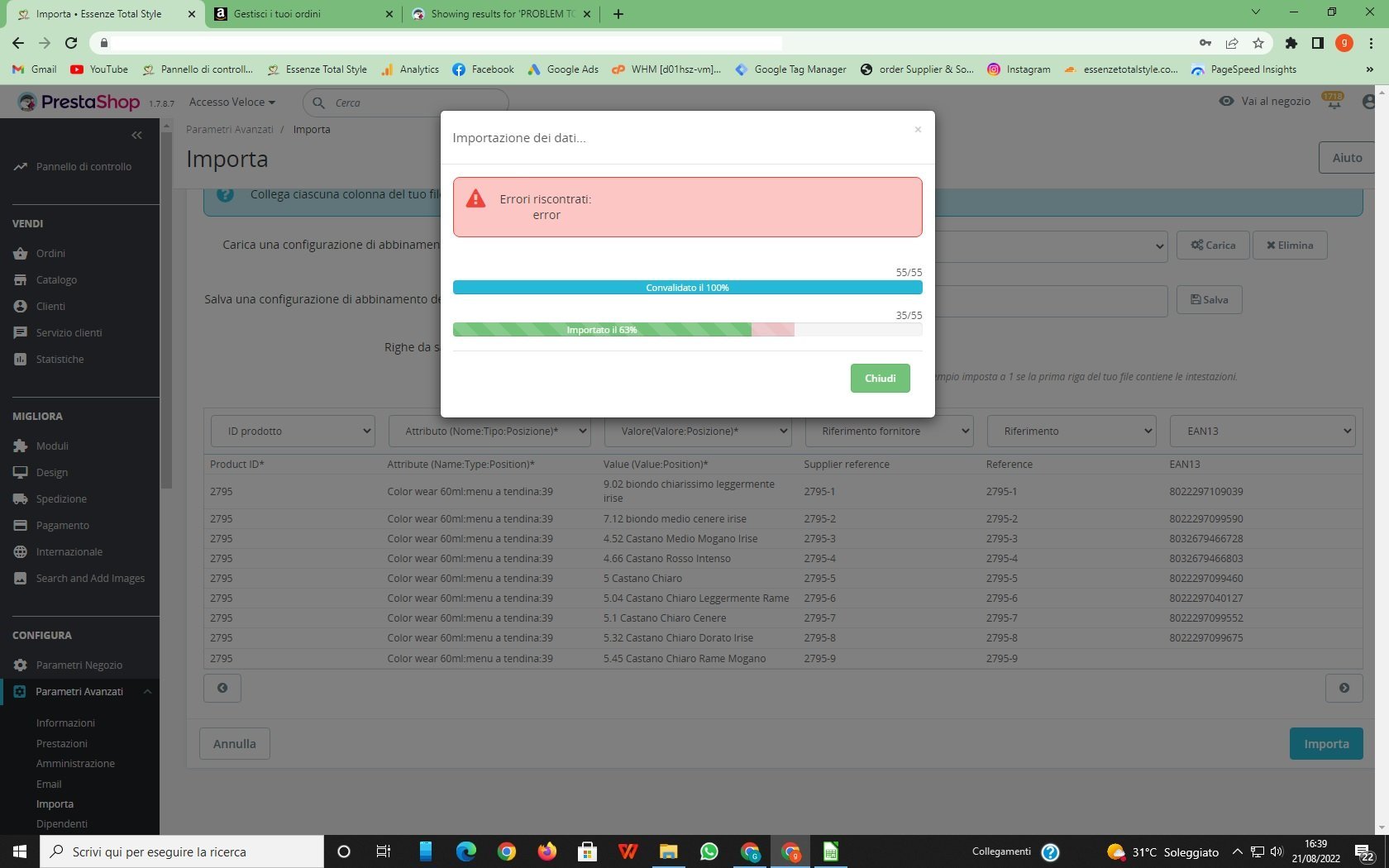 Essenze Total Style Posted August 21, 2022 Share Posted August 21, 2022 (edited) Ciao ho un problema da quando ho installato 1.7.8.7. provo a importare una combinazione ma ricevo ancora un errore senza alcun codice. Interrompi l'importazione e devo ricominciare dal termine dell'importazione del file (importa ogni volta 1 combinazione) Ho capito che il problema è nella quantità della combinazione .Se =0 importa senza problemi .Se >0 si ferma ogni volta Qualcuno può aiutarmi? io uso anche il vecchio file già importato ma la stessa storia Grazie Edited August 21, 2022 by Essenze Total Style (see edit history) Link to comment Share on other sites More sharing options...