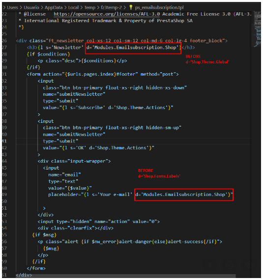 Welele Posted September 1, 2022 Author Share Posted September 1, 2022 (edited) Hello again You right! Developer of my theme have an override of these modules. /themes/theme_name/modules/ps_emailsuscription/view/templates/hook/ps_emailsuscription.tpl But we got translation problem about this override because developer change the translation references. Then I have changed again and translation works: but I dont know why they change translation references: Shop.Theme.Global Shop.Forms.labels Why they use these references instead of Modules.Emailsuscription.shop? Using his references tranalation doesnt work... Is it better to apply the translations in the references that they use (Shop.Theme.Global & Shop.Forms.labels)? Where can I apply it? Thanks for response and best regards Edited September 1, 2022 by Welele (see edit history) Link to comment Share on other sites More sharing options...