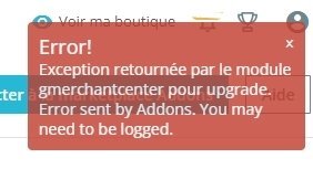 ps2021 Posted September 8, 2022 Author Share Posted September 8, 2022 (edited) Merci HeineFR, Je te montre comment je fais: Dans l'admin PS, je passe par la page de gestion de mes modules installés (Modules -> Modules manager ) (Je ne me connecte pas à "ADDONS") puis en haut à droite, je clique sur: "Mises à jour" (il y a un petit "1" dans un rond marron sur cet onglet). Et là, je clique sur "Upgrade"... Réponse (comme l'image ci-dessus au début de ce sujet) : "you may need to be logged" Après, j'ai essayé de me connecter, mais le module n'apparait pas dans la nouvelle page (comme la plupart de mes modules). Il y en a que quelques autres qui apparaissent... Et c'est ça que je ne comprends pas... Edited September 8, 2022 by ps2021 (see edit history) Link to comment Share on other sites More sharing options...
