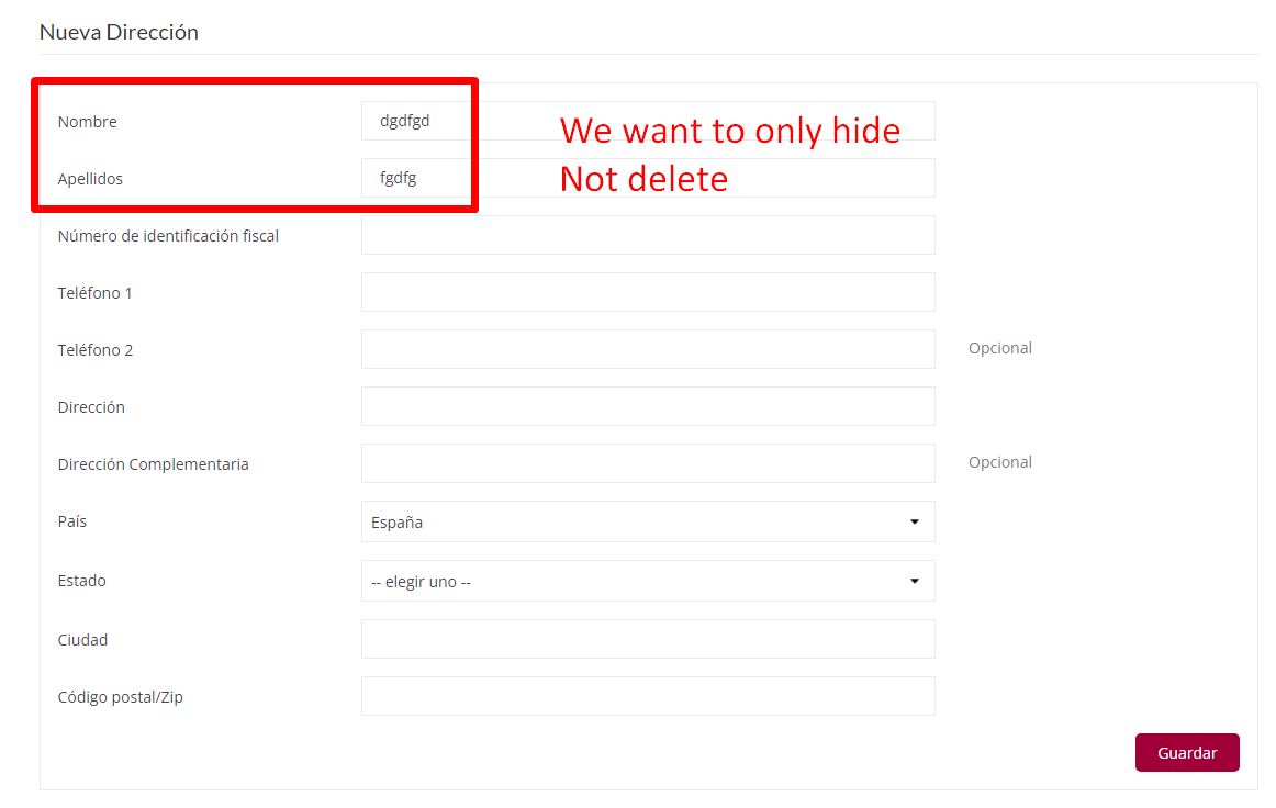 Welele Posted September 9, 2022 Share Posted September 9, 2022 Hi Its possible to hide (not delete) thses fields. When customer is registered insert name & lastmane. Whe register his address, system autofill the fields. That is good, but have any option to hide them? We want theses fields, and keep like required, but its possible to hide and register with autofilled data when address is registered? Best regards Link to comment Share on other sites More sharing options...