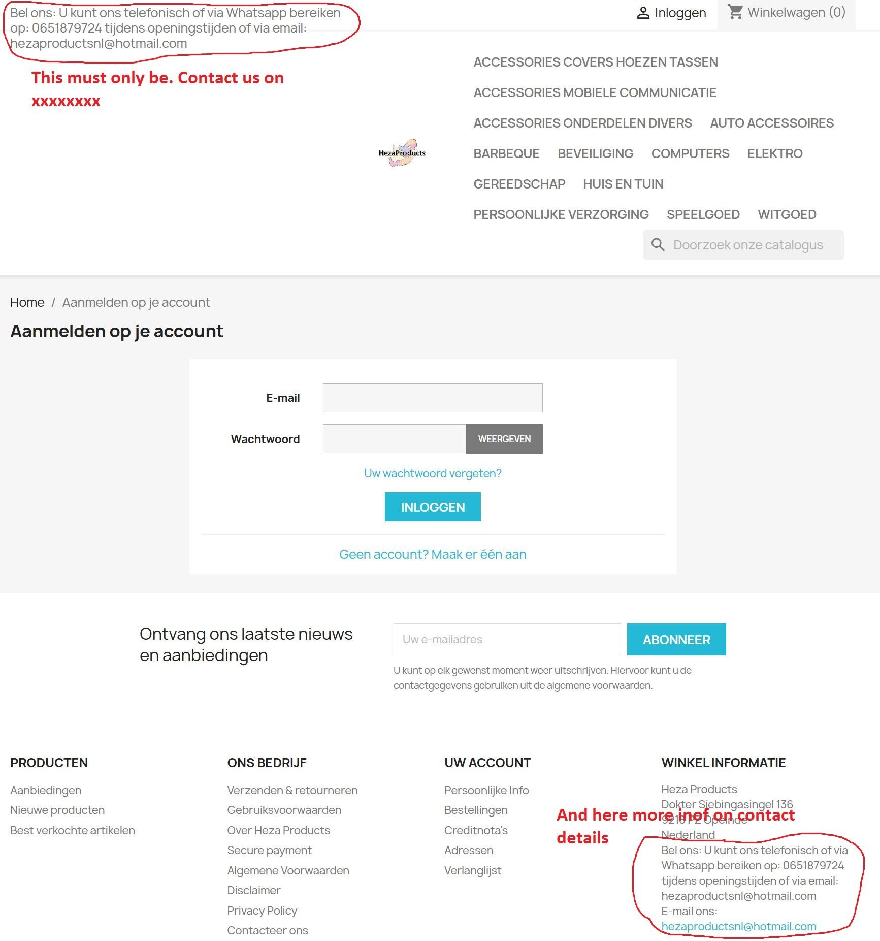Lizenka Posted September 12, 2022 Author Share Posted September 12, 2022 On 9/9/2022 at 3:11 PM, ComGrafPL said: Can you share url? Here or in private. www.hezaprducts.nl you will see on my website in the top left corner contact etails and below in the right corner contact details. So I wondered if I could change them separatly. Link to comment Share on other sites More sharing options...