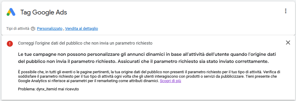 Mitconsulting Posted September 9, 2022 Share Posted September 9, 2022 Buonasera, volevo sapere se qualcuno mi può aiutare a configurare correttamente Il mio sito per sfruttare le potenzialità di Googla ads con la personalizzazione degli annunci dinamici. Io ho il sito in PS 1.7.8.7 e utilizzo un modulo per inviare i al Google Tag Manager e un modulo per inviare i dati al Google Merchant Center. Il problema che nonostante varie volte sono intervenuti i tecnici google non riescono a risolvere il problema. Io continuo ad avere l'errore come in allegato. Qualcuno saprebbe darmi qualche dritta e come risolvere questo problema? Link to comment Share on other sites More sharing options...