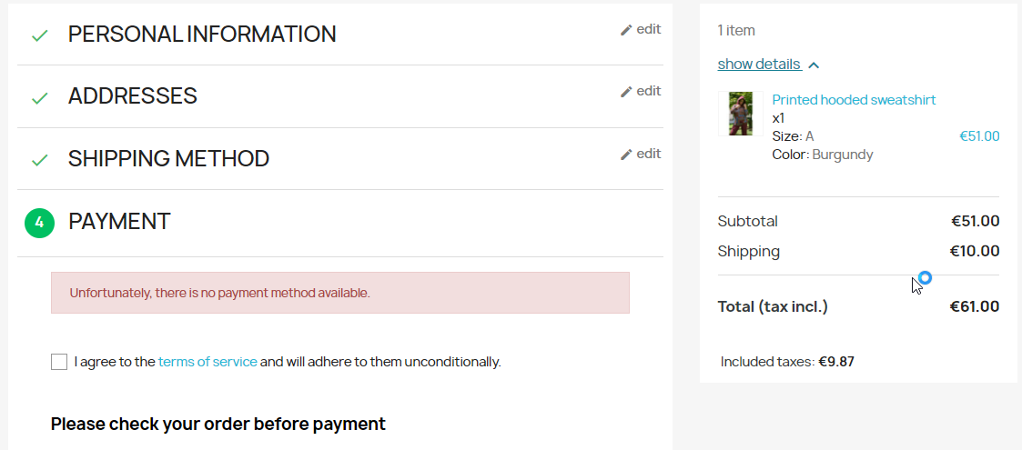 Per-Arne Posted September 11, 2022 Share Posted September 11, 2022 Hi, I have been searching for the solution to my issue for a while now. I have installed PrestaShop Checkout and have configured it by connecting PayPal and my prestashop account. The status states "Available" and "Enabled" on PayPal. And at checkout everything seem to work and the checkout buttons are available. Although when I try to walk through the Checkout flow I end up with the message: "Unfortunately, there is no payment method available." I have enabled PrestaShop checkout for all contries, for all groups, for all currencys and for all delivery methods. Without any success... could there be any issues with my hooks? I have tried to compare to the PrestaShop demo BackOffice but I'm not able to find the issue, I hope that you all can give me some advices. Regards Link to comment Share on other sites More sharing options...