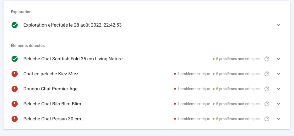 HeineFR Posted September 16, 2022 Share Posted September 16, 2022 Je viens de voir que ton pseudo était le nom de ton site. 😅 Lorsque je regarde le produit "Doudou Lapin Rose En Coton Bio 30 cm Sigikid" Les données structurées sont bonnes : <!-- JSON-LD markup generated by Google Structured Data Markup Helper. From DB --> <script type="application/ld+json" data-keepinline="true" data-nocompress="true"> { "@context" : "https://schema.org", "@type" : "Product", "name" : "Doudou Lapin Rose En Coton Bio 30 cm Sigikid", "image" : "https://c2.zepelucheclub.com/554-home_default/doudou-lapin-en-coton-bio-30-cm-sigikid.jpg", "description" : "Offrez ce doudou plat lapin en coton bio pour fille, entièrement organique et de 30 cm de la marque Sigikid, un doudou en vichy rose pour les plus petites au toucher très doux et totalement hypoallergénique", "category" : "Petits Prix", "sku" : "38995", "mpn" : "38995", "brand": { "@type": "Brand", "name": "Sigikid" }, "url" : "https://zepelucheclub.com/62-doudou-lapin-en-coton-bio-30-cm-sigikid.html", "offers": { "@type": "Offer", "priceCurrency": "EUR", "availability": "https://schema.org/InStock", "price": "29.99", "priceValidUntil": "2050-12-31", "url": "https://zepelucheclub.com/62-doudou-lapin-en-coton-bio-30-cm-sigikid.html", "seller": { "@type": "Organization", "name": "zepelucheclub.com" } }, "sameAs": [ "", "", "", "", "", "" ] } </script> En revanche, Il y a bien des erreurs qui sont retournées pour les produits featured qui disposent d'un balisage supplémentaire dans le template, pas en json comme au dessus. Link to comment Share on other sites More sharing options...