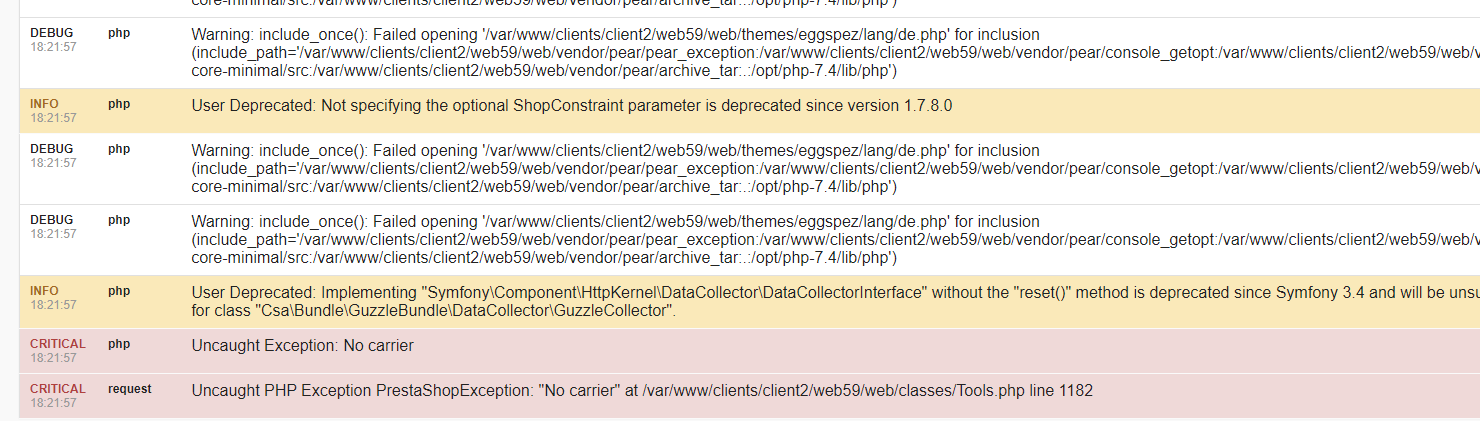 hoef_gart Posted September 19, 2022 Share Posted September 19, 2022 I have a multistore and when I want to click on an order with only a virtual product in the BO, an internal server error occurs. If a physical product is in the order no internal server error is generated. In debug-mode I get the message no carrier. Oops... looks like an unexpected error occurred An exception has been thrown during the rendering of a template ("Invalid $number parameter: "" cannot be interpreted as a number"). [Twig\Error\RuntimeError 0] ********************************************************************** Serverdaten Linux #1 SMP Thu Jan 4 16:43:57 MSK 2018 x86_64 Version der Server-Software nginx/1.21.6 PHP-Version 7.4.30 Speichergrenze 512M max_execution_time: 30 Upload (max. Dateigröße) 100M info_outline Datenbank MySQL-Version 10.2.17-MariaDB-10.2.17+maria~stretch MySQL-Server 127.0.0.1 MySQL-Name c1w59db1 MySQL-Anwender c1w59db1 Tabellen-Präfix: ps_ MySQL-Engine InnoDB MySQL-Treiber DbPDO info_outline Shop-Einstellungen PrestaShop-Version 1.7.8.7 Shop-URL http://relaunch.egg-spezialist.de/ Shop-Pfad: /var/www/clients/client2/web59/web Aktuell verwendetes Template: eggspez Thanks Link to comment Share on other sites More sharing options...