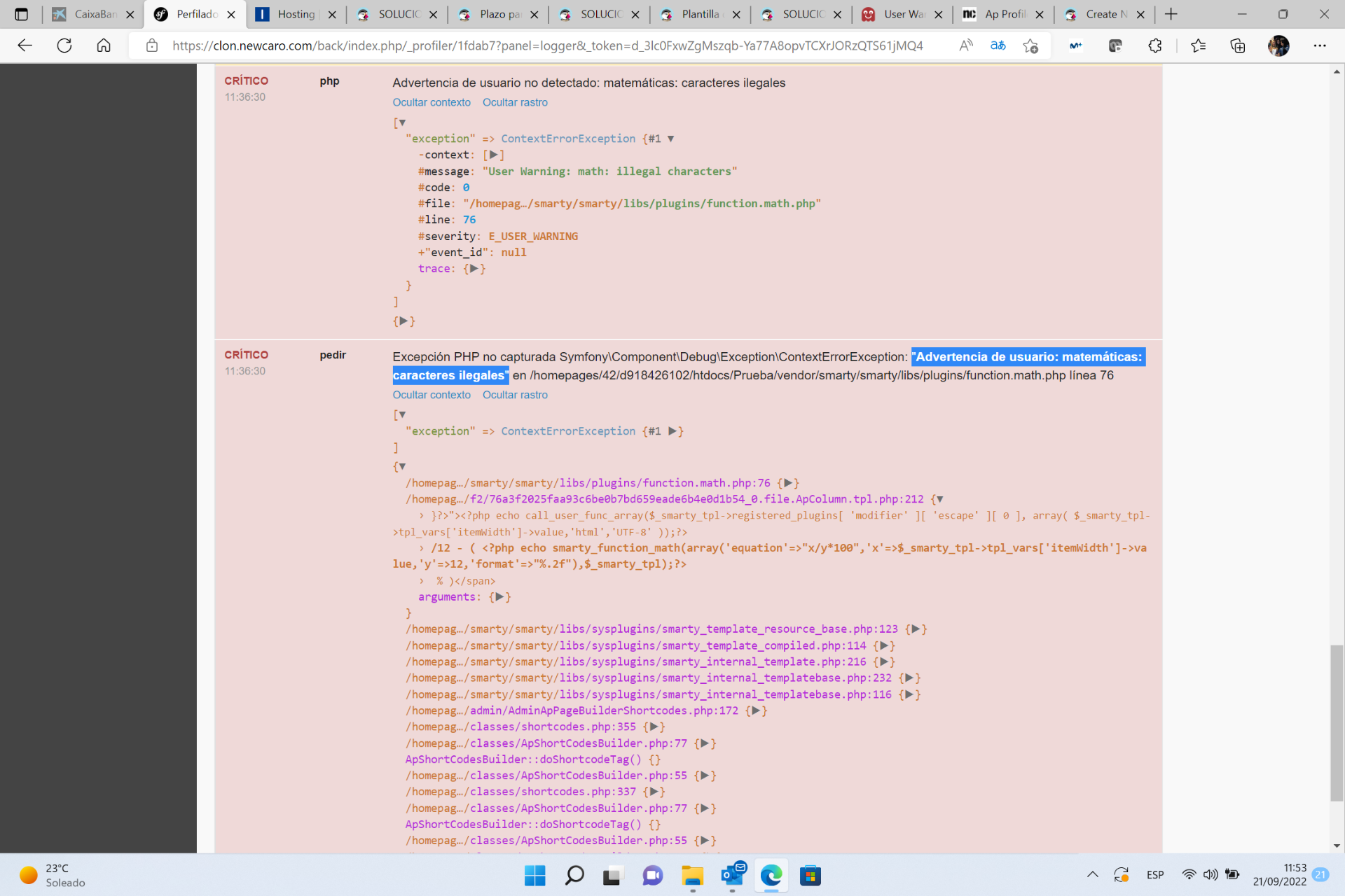 zsr Posted September 21, 2022 Share Posted September 21, 2022 Hola, recientemete hemos actualizado a la última versión de prestashop y estamos con la versión PHP 7.4 Trabajamos con Prestashop 1.7.8.7. y cuando activo el modo depuración al entrar en Ap Profiles Manage da el error: CRÍTICO php Advertencia de usuario no detectado: matemáticas: caracteres ilegales CRÍTICO pedirExcepción PHP no capturada Symfony\Component\Debug\Exception\ContextErrorException: "Advertencia de usuario: matemáticas: caracteres ilegales" en /homepages/42/d918426102/htdocs/Prueba/vendor/smarty/smarty/libs/plugins/function.math.php línea 76 Adjunto imagen con los detalles del error. No sé si tendrá relación pero no podemos modificar los widgets en Ap Hook Builder, sí crear nuevos pero no modificar los ya creados. En modo operativa la página web funciona correctamente, no da problemas. Sabéis cómo se puede solucinar?? Link to comment Share on other sites More sharing options...