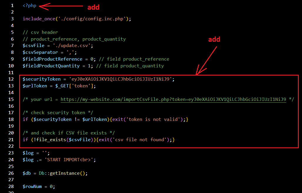 4presta Posted October 9, 2022 Share Posted October 9, 2022 E.g.: $securityToken = 'eyJ0eXAiOiJKV1QiLCJhbGciOiJIUzI1NiJ9'; $urlToken = $_GET['token']; /* your url = https://my-website.com/importCsvFile.php?token=eyJ0eXAiOiJKV1QiLCJhbGciOiJIUzI1NiJ9 */ /* check security token */ if ($securityToken != $urlToken){exit('token is not valid');} /* and check if CSV file exists */ if (!file_exists($csvFile)){exit('csv file not found');} Link to comment Share on other sites More sharing options...