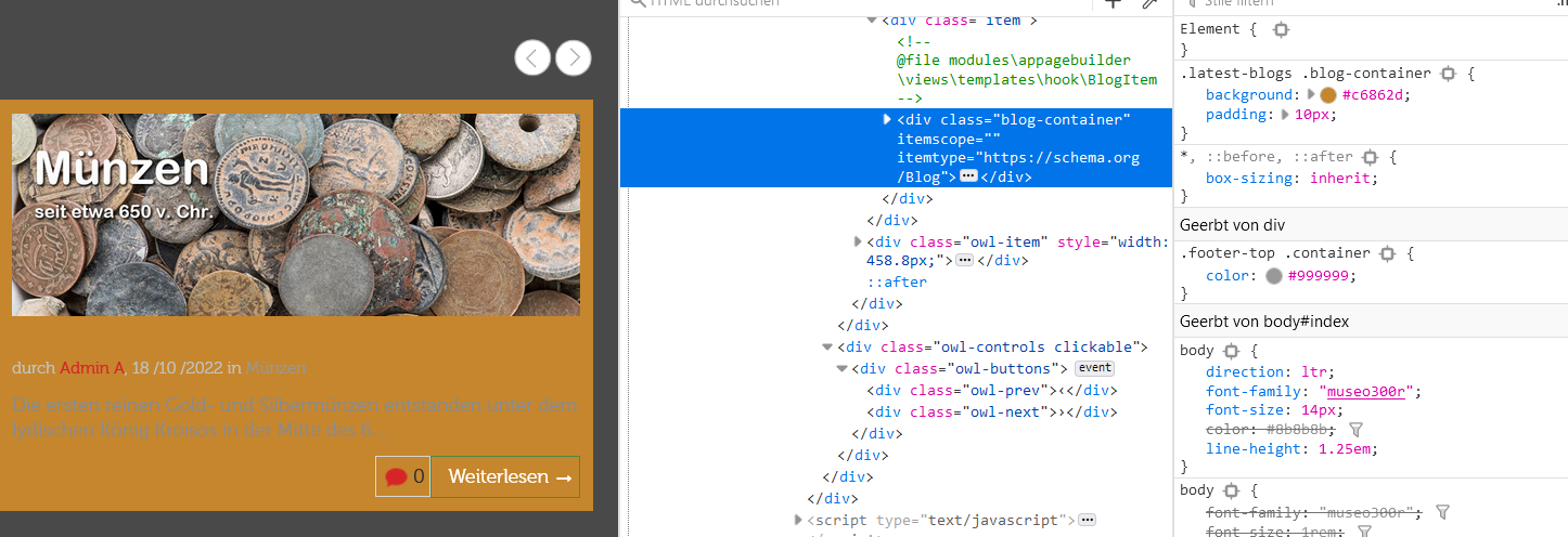 JBW Posted October 21, 2022 Share Posted October 21, 2022 Sowas kannst du super mit der "Untersuchen" Funktion in deinem Browser finden. In dem Fall ist es .latest-blogs .blog-container { background: #c6862d; padding: 10px; } Link to comment Share on other sites More sharing options...