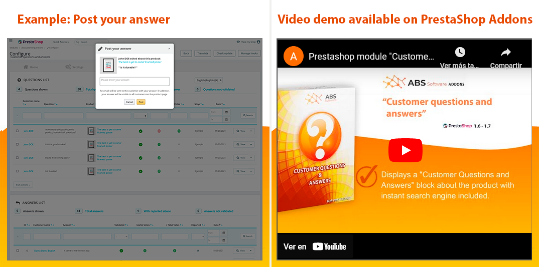 Yelish Posted October 27, 2022 Share Posted October 27, 2022 Hi, here is a new module to help answer customer questions about products: Customer questions and answers Module Displays a "Customer Questions and Answers" block about the product (such as Amazon) with instant search engine included. Questions can be answered by the seller or by customers who bought the product. Link to Prestashop Addons: https://addons.prestashop.com/en/faq-frequently-asked-questions/86524-customer-questions-and-answers.html This module encourages your customers to solve their doubts about the product and to finalize their purchases. It improves customer relations by allowing other customers who have purchased the product to answer any questions potential customers may have about the product, increasing confidence in your product and your shop. Features When a customer posts a question, emails will be sent to the number of customers you have set in the module settings who have most recently purchased the product. From that email or from your shop they will be able to answer the question. The customer will receive an email notification when someone answers their question giving them the opportunity to thank the customer/salesperson for their help. Customers can rate the most useful questions and answers, as well as report abusive answers. It streamlines the process of answering customer questions about the product by allowing customers to consult questions and answers from previous customers with an easy to use instant search engine included. The instant search engine ignores the most common words (2 characters), searches for exact matches for words with 3 characters or performs partial searches for words with 4 or more characters among all product questions and answers showing the results instantly. The instant search engine will also search for matches in the product description and data sheet. You can also set up a blacklist of words to be ignored by the search engine in a certain language. By clicking on any question the customer is sent to the answers page. From here the customer can see all the answers to the question and perform the same actions as on the product page (answer the question, vote on the usefulness of the answers and report abuse). In the settings, among several presentation options, you can set whether you want questions and answers to require validation or not, as well as set a minimum time between the publication of questions or answers by the same user. You can also set the number of unanswered questions that there must be for the module to notify you by email. In this way, we avoid being bothered every time a user asks a question in the store and provide the opportunity for the user community to answer the questions. In the configuration you can include some layout options for links and buttons without having to modify the module stylesheet. You can see how they look in the examples under the layout options. Managing questions and answers is easy. Validating, viewing answers and questions, deleting, copying and even answering questions from your module is fast with our interface that quickly displays your actions via AJAX. Use the filters and receive information immediately. You can manage both question and answer tables at the same time and without leaving the management page. The changes you make will be displayed in the other table in real time without any problem. Filters and quick links are displayed immediately with AJAX. For more information, video demo, demos and documentation Link to Prestashop Addons: https://addons.prestashop.com/en/faq-frequently-asked-questions/86524-customer-questions-and-answers.html Thanks for your time! Link to comment Share on other sites More sharing options...