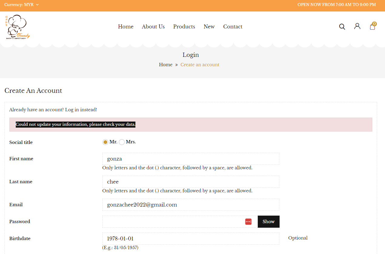 "Could not update your information, please check your data." when create new user account.