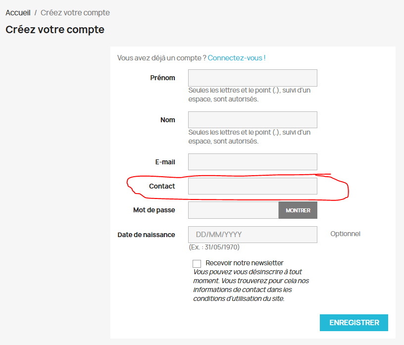 YANNICK PATRICE Posted November 2, 2022 Share Posted November 2, 2022 Bonjour, J ai réussi a ajouter le champ ''contact" dans le formulaire d'inscription de PrestaShop. cependant j'arrive pas a recevoir le contact lorsqu'un nouveau client crée son compte. Je vous montre le formulaire d'inscription et le champ que j ai ajouté. Je sollicite votre aide pour résoudre ce problème. Link to comment Share on other sites More sharing options...