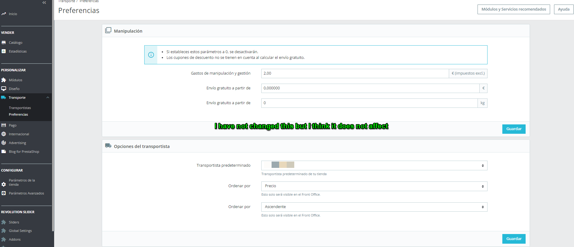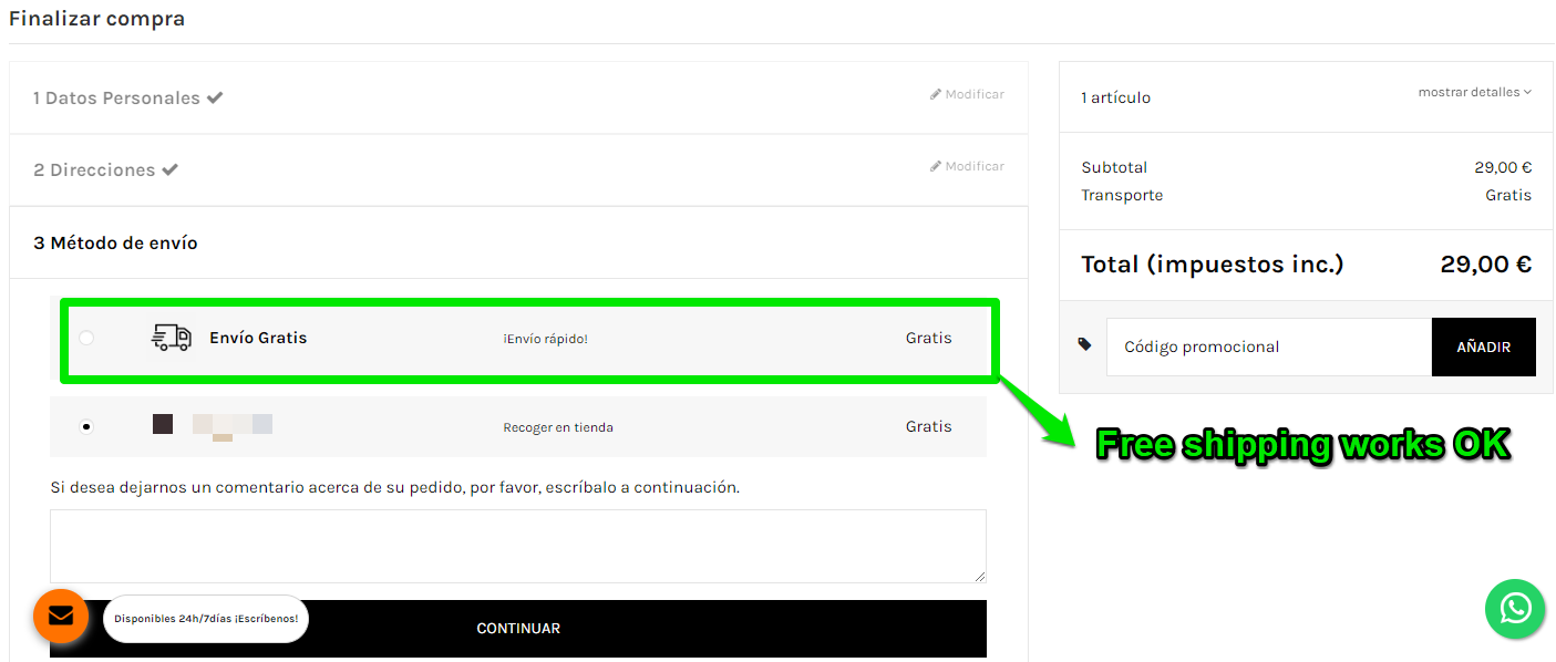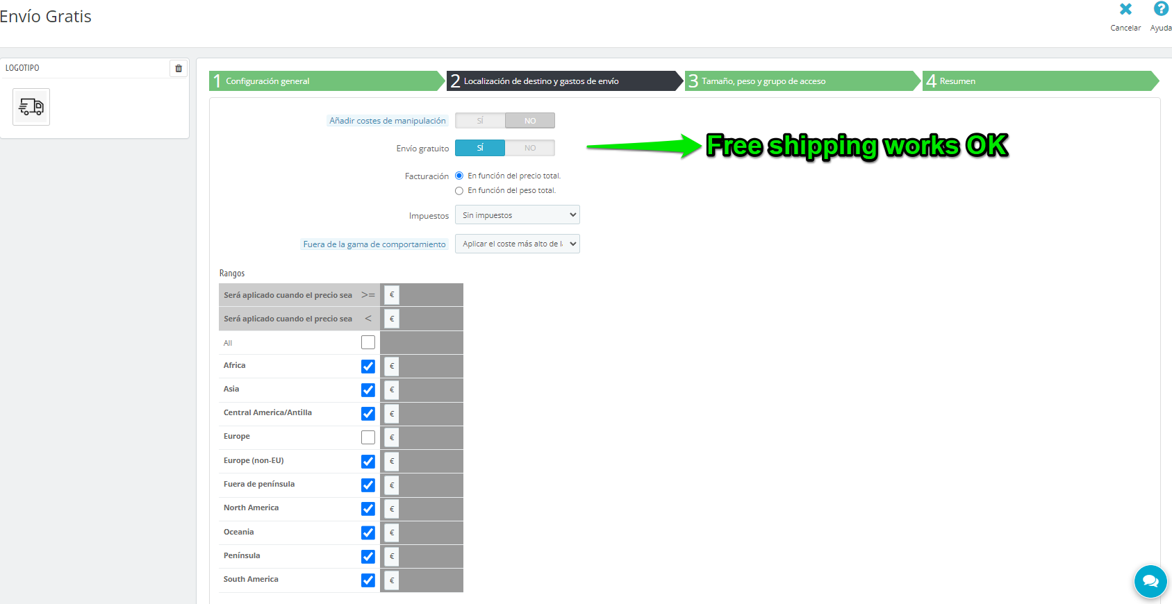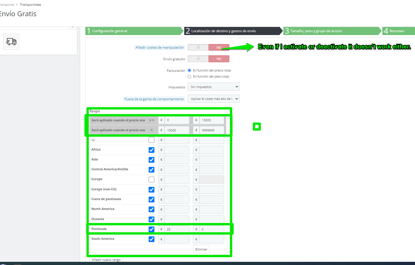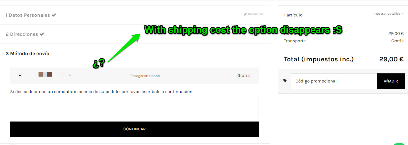 hombredeincognito Posted November 5, 2022 Share Posted November 5, 2022 (edited) Hello, I am trying to change the free shipping costs and configure shipping costs by price (attached screenshots). > Prestashop 1.7.6 Data I have reviewed: Products do not have types or models. Only products with price. The products are active for all types of carriers. In Payment > Preferences, the carrier and the country are active and correct I have tried clearing the cache and entering an incognito window creating a new shopping cart. The problem is that when my carrier is free and I set it to have a cost according to the value of the cart, the carrier disappears from the cart. Any idea what is happening? I'm sorry for my English. Thank you! Edited November 5, 2022 by hombredeincognito (see edit history) Link to comment Share on other sites More sharing options...