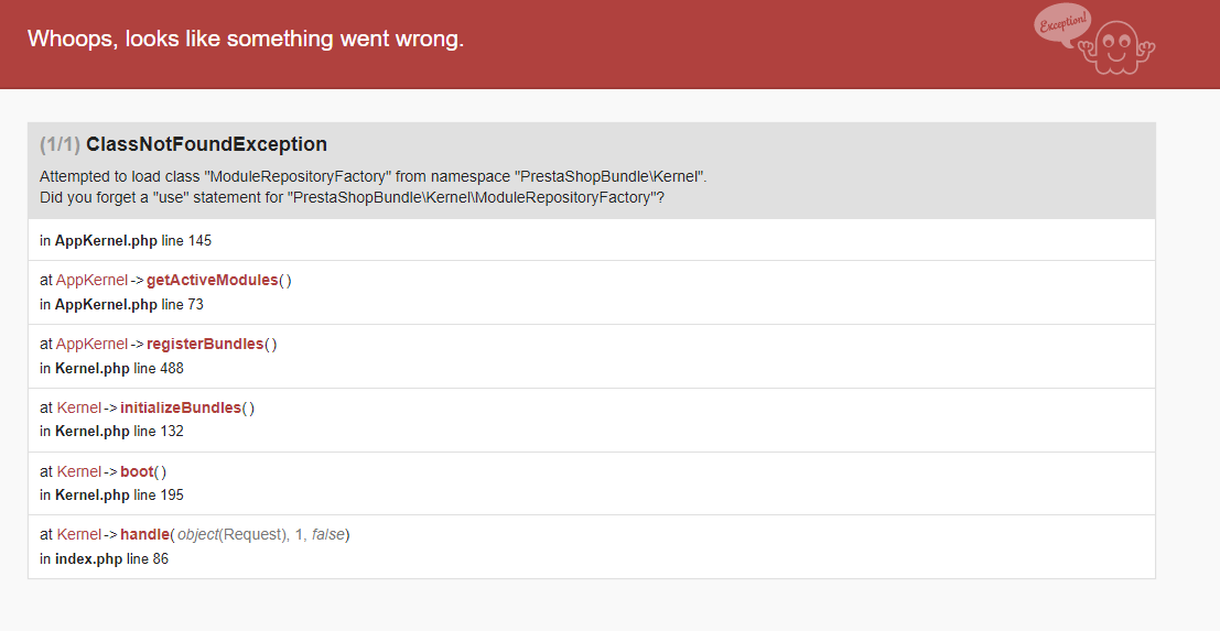 Daftcorp Posted November 15, 2022 Share Posted November 15, 2022 (edited) Bonjour, Mon site est en erreur 500, voici le message en mode Debug : Quote Warning: include(/home/kbsgnbh/www/vendor/composer/../../src/Core/ContainerBuilder.php): failed to open stream: No such file or directory in /home/kbsgnbh/www/vendor/composer/ClassLoader.php on line 444 Warning: include(/home/kbsgnbh/www/vendor/composer/../../src/Core/ContainerBuilder.php): failed to open stream: No such file or directory in /home/kbsgnbh/www/vendor/composer/ClassLoader.php on line 444 Warning: include(): Failed opening '/home/kbsgnbh/www/vendor/composer/../../src/Core/ContainerBuilder.php' for inclusion (include_path='/home/kbsgnbh/www/vendor/pear/pear_exception:/home/kbsgnbh/www/vendor/pear/console_getopt:/home/kbsgnbh/www/vendor/pear/pear-core-minimal/src:/home/kbsgnbh/www/vendor/pear/archive_tar:.:') in /home/kbsgnbh/www/vendor/composer/ClassLoader.php on line 444 Fatal error: Uncaught Error: Class 'PrestaShop\PrestaShop\Core\ContainerBuilder' not found in /home/kbsgnbh/www/config/bootstrap.php:34 Stack trace: #0 /home/kbsgnbh/www/config/config.inc.php(57): require_once() #1 /home/kbsgnbh/www/admin1035/index.php(40): require('/home/kbsgnbh/w...') #2 {main} thrown in /home/kbsgnbh/www/config/bootstrap.php on line 34 Merci pour votre aide. Edited November 29, 2022 by Daftcorp (see edit history) Link to comment Share on other sites More sharing options...