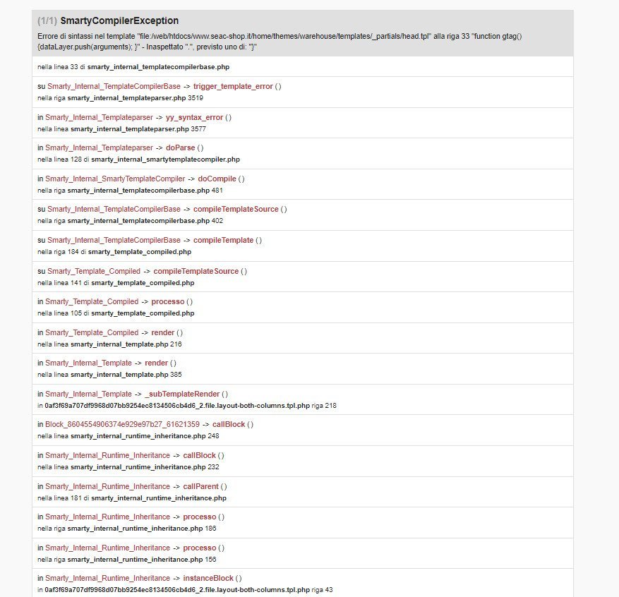 VincenzoPUG Posted November 16, 2022 Share Posted November 16, 2022 HELP Me: ho installato il prestashop paylater e senza nemmeno configurarlo il mio prestahop dice Errore di sintassi nel template "file:/web/htdocs/www.seac-shop.it/home/themes/warehouse/templates/_partials/head.tpl" alla riga 33 "function gtag(){dataLayer.push(arguments); }" - Inaspettato ".", previsto uno di: "}" che dice???? come posso risolvere? Link to comment Share on other sites More sharing options...
