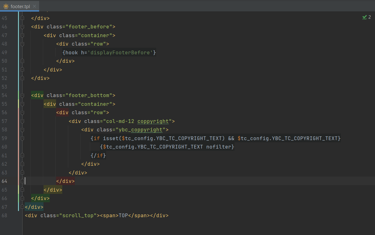 TomatoYukota Posted November 17, 2022 Share Posted November 17, 2022 Requiero modificar mi Copyright, pero en este tema el código es diferente al codigo del tema clasic. realizarlo desde traducciones es imposible. la unica alternativa que veo es tocando el codigo. les dejo adjunto el footer.tpl footer.tpl Link to comment Share on other sites More sharing options...