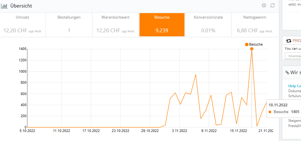 Verena18 Posted November 21, 2022 Share Posted November 21, 2022 (edited) Hallo zusammen, ich habe meine Homepage Ende Oktober veröffentlicht, allerdings habe ich Freunde und Bekannte erst am 19. informiert. Seit der Veröffentlichung Ende Oktober sehe ich in der Übersicht "seltsam" viele Besucher - ich glaube nicht, dass das stimmen kann. Teilweise sind da über 1'400 Besucher an einem Tag gezählt worden. Selbst wenn das stimmen würde, wäre ich doch arg enttäuscht, wenn da keiner was bestellt hätte 🙂 Wenn ich links dann auf "Online Besucher" klicke, erscheint nur die Info "Modul nicht gefunden". Welches Modul wäre das denn? ich hatte letzte Woche das Problem, dass weder Upgrade noch Deinstallation von Prestashop Metrics nicht funktioniert hatte - daraufhin habe ich ein Backup wiederhergestellt. (da das BO nur noch im Debug-Modus lief, ich habe hierzu auch ein Topic erstellt). Kann es damit zusammenhängen, dass scheinbar Prestashop Metris nicht funktioniert? Aber irgendwoher müssen die Besuche doch kommen.... Danke für Eure Hilfe und viele Grüsse Verena Edited November 21, 2022 by Verena18 (see edit history) Link to comment Share on other sites More sharing options...