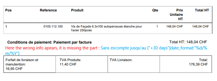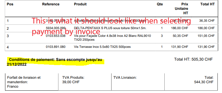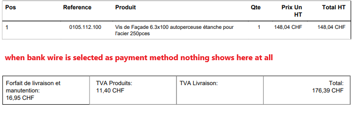 ptityop Posted November 21, 2022 Share Posted November 21, 2022 Hello, I have modified the invoice with some custom code but I am facing the following issues : When payment by invoice is selected upon order the invoice should print the following : <b>{l s='Conditions de paiement: ' pdf='true'}</b>Sans escompte jusqu'au {"+30 days"|date_format:"%d/%m/%Y"}<br/> If another payment is selected (in my case only other option is bank wire then it should only show payment method and the total EXCL tax. When payment by invoice (Facture) is selected it only shows <b>{l s='Conditions de paiement: ' pdf='true'}</b>{$payment->payment_method} and when Bank wire is selected it does not show anything at all, I don't see where the error is ... This is the complete code and I attached screenshots with comment to help understanding. Thanks for any help <table id="payment-tab" width="100%" style="border: none;"> <tr> <td class="white payment left big bold" width="54%">{foreach from=$order_invoice->getOrderPaymentCollection() item=payment} {if $payment->payment_method eq 'Facture'} {if $payment->amount eq $order_invoice->total_paid_tax_incl} <b>{l s='Conditions de paiement: ' pdf='true'}</b>Sans escompte jusqu'au {"+30 days"|date_format:"%d/%m/%Y"}<br/> {/if} {else} <b>{l s='Conditions de paiement: ' pdf='true'}</b>{$payment->payment_method} {/if} {/foreach}</td> <td class="payment left white" width="46%"> <table width="100%" border="0"> {foreach from=$order_invoice->getOrderPaymentCollection() item=payment} <tr> <td class="right big"> {l s='Total HT: ' pdf='true'}{displayPrice currency=$order->id_currency price=$order_invoice->total_products}</td> </tr> {/foreach} </table> </td> </tr> </table> Link to comment Share on other sites More sharing options...