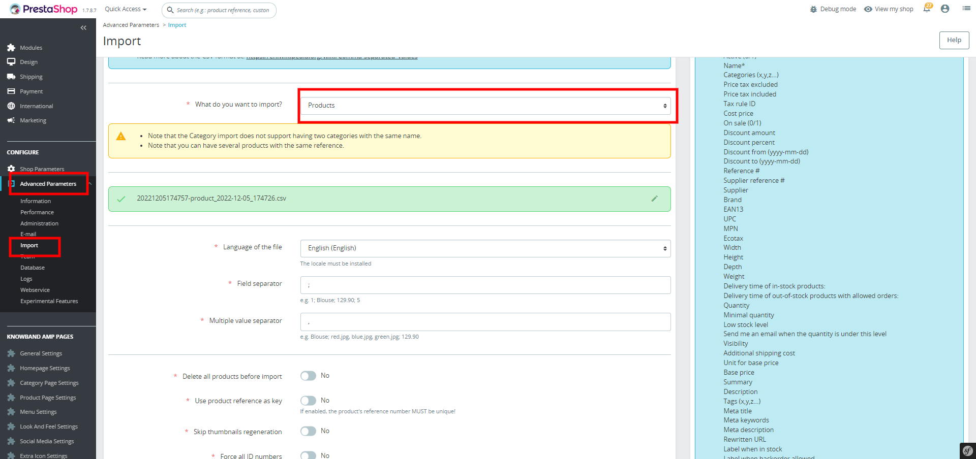 ->Y luego importe el CSV actualizado desde aquí. Captura de pantalla para referencia: