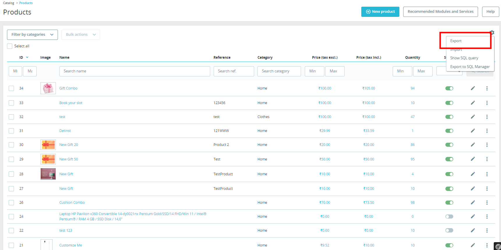 Exporte amablemente todos los productos para los que desea actualizar el precio. Captura de pantalla para referencia: