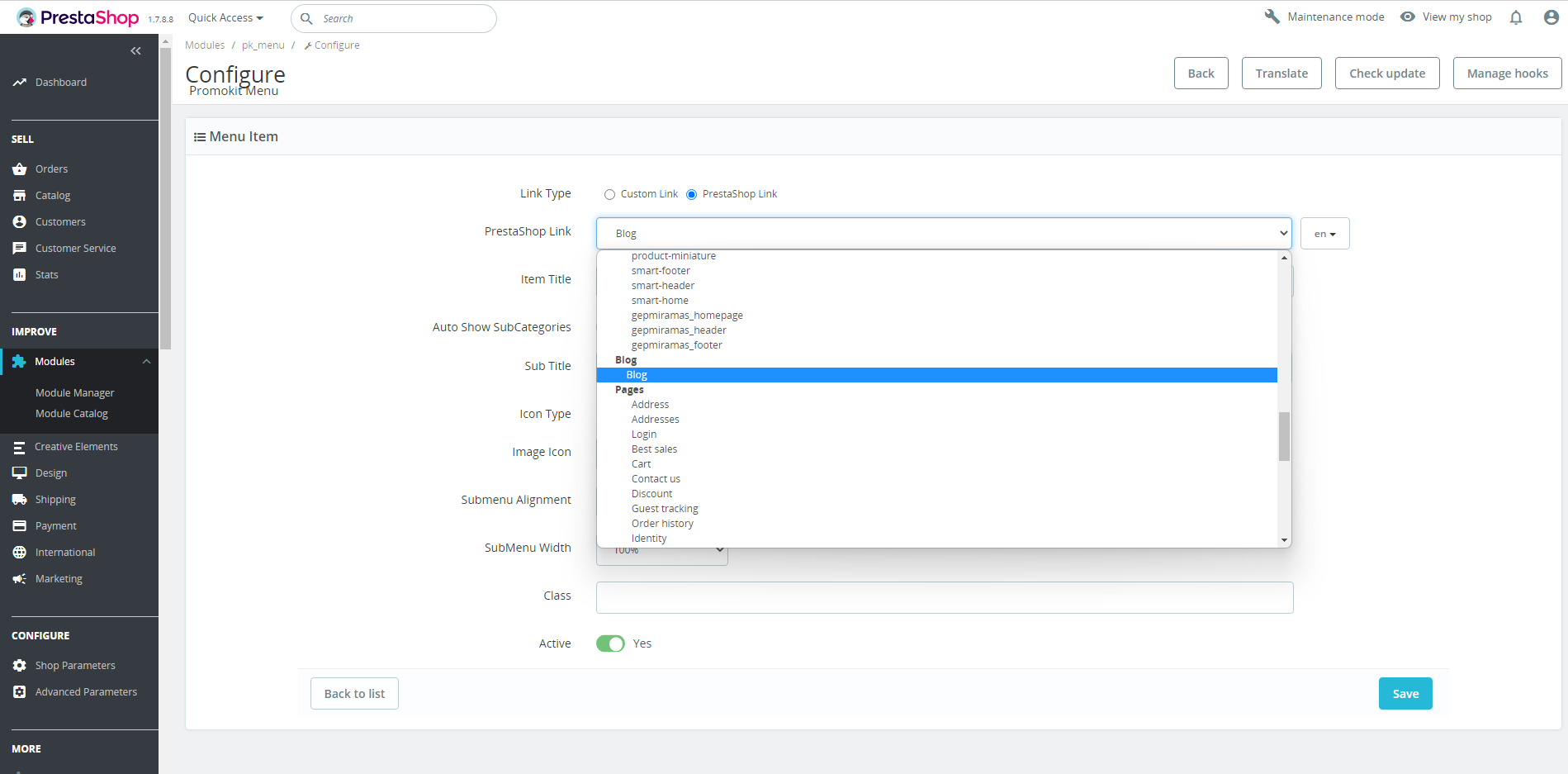 Mediacom87 Posted December 13, 2022 Share Posted December 13, 2022 Bonjour, 1- vous n'utilisez pas le menu natif de PrestaShop mais un menu inclus dans votre thème, un léothème en plus au regard du nom de ce module, donc n'hésitez pas à faire appel à leur support pour avoir un accompagnement adapté à l'usage de leur module 2- Vous parlez du blog, mais PrestaShop n'intègre pas de Blog nativement, donc, idem que la première réponse, contactez le support du module tiers pour connaître son fonctionnement et être accompagné au mieux dans son usage. Link to comment Share on other sites More sharing options...
