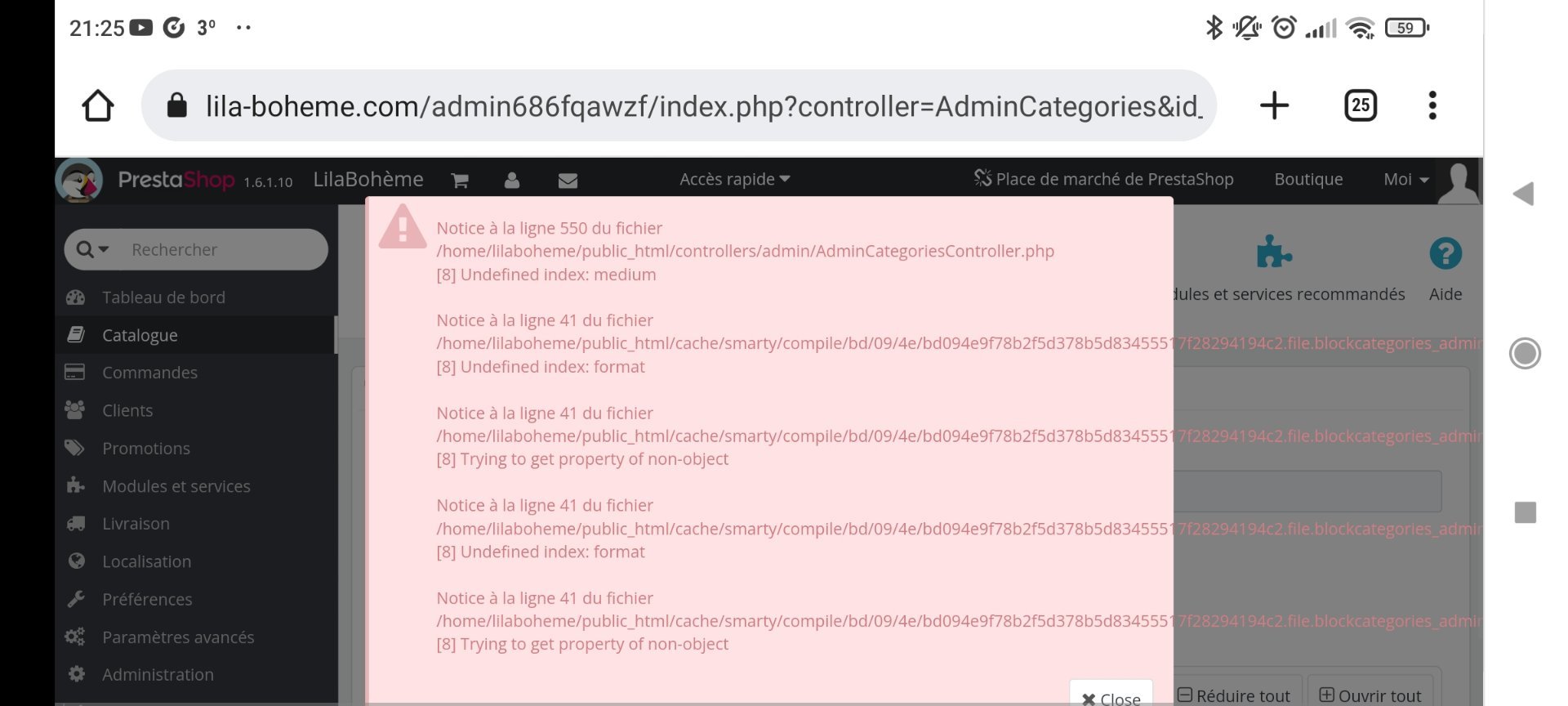 lilaboheme35 Posted December 15, 2022 Author Share Posted December 15, 2022 @Eolia bonsoir Me voilà de retour avec ces nouvelles erreur ( en pièce jointe) Cela s affiche quand je clique sur modifier mes catégories Je suis parfaitement perdu Y a t il une bonne âme pour m aider à résoudre ce problème Merci d avance Belle soirée à vous Jennifer Link to comment Share on other sites More sharing options...