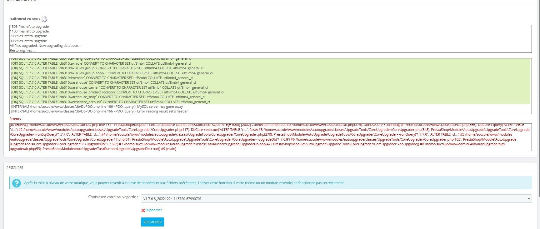 jom2 Posted December 24, 2022 Share Posted December 24, 2022 (edited) Bonjour Afin d'utiliser un module qui requiere la derniere version Prestashop, j'ai mis à jour la boutique et j'ai eu un souci (voir ci-dessous) J'ai donc activé une preiere fois la sauvegarde qui n'a pas fonctionné puis une deuxième qui a été prise en compte. Mais je n'arrive plus à me connecté à mon back office et le site est en mode maintenance. Pouvez vous m'aider ? Edited December 24, 2022 by jom2 (see edit history) Link to comment Share on other sites More sharing options...