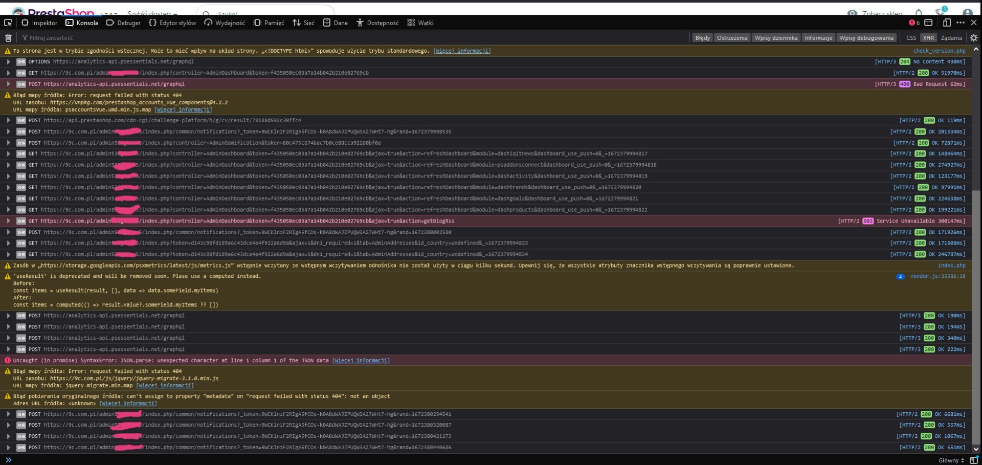 Amadek Posted December 30, 2022 Share Posted December 30, 2022 Dzie艅 dobry, W dniu wczorajszym panel administratora zacz膮艂 dzia艂a膰 bardzo wolno. Sta艂o si臋 to bez wyra藕nej przyczyny (nie by艂 zmieniany kod, nie by艂a dodawana nowa wtyczka lub zmieniane ustawienia). Dzia艂anie panela administracyjnego jest tak wole, 偶e praktycznie uniemo偶liwia jakiekolwiek dzia艂anie. Sta艂o si臋 nagle, samoistnie dlatego trudno mi znale藕膰 rozwi膮zanie problemu. Przesy艂am zrzuty ekranu z konsoli debugowania. Konsola wy艣wietla jakie艣 b艂臋dy zwi膮zane z JSON. Czy co艣 Wam to m贸wi drodzy forumowicze? Link to comment Share on other sites More sharing options...