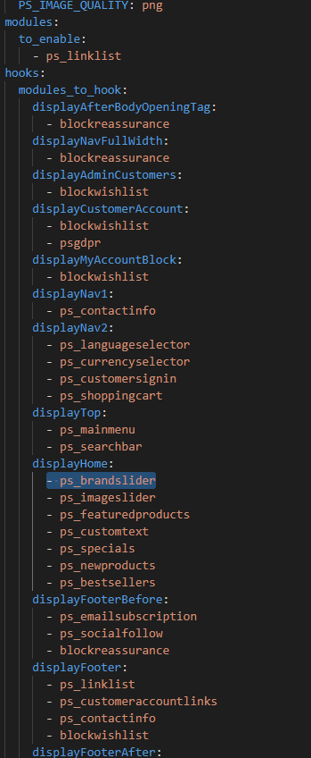 Dokonałem zmian we wszystkich plikach moduły zmieniając linijki związane ze sliderem tak aby wskazywał na moja nazwę "ps_brandslider" dodałem do theme.yml wpis który mówi w której części ma być wyświetlany, plik tpl również został utworzony, dlaczego nie pokazuje mi go w modułach? Sam moduł działa prawidłowo tzn. dodanie, edycja, usunięcie marki, którą chciałbym umieścić.