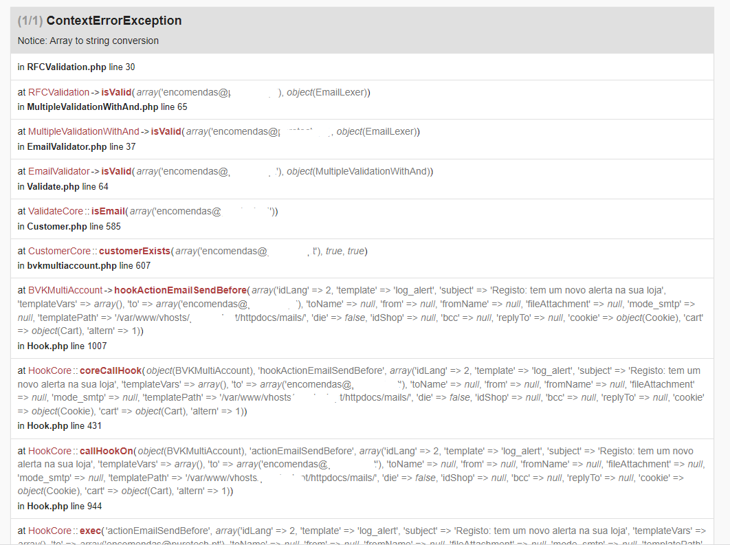 in BVKMultiAccount->hookActionEmailSendBefore(array('idLang' => 2, 'template' => 'log_alert', 'subject' => 'Log: you have a new alert in your store', 'templateVars' => array(), 'to' => array('[email protected]'), 'toName' => null, 'from' => null, 'fromName' => null, 'fileAttachment' => null, 'mode_smtp' => null , 'templatePath' => '/var/www/vhosts/websitename.pt/httpdocs/mails/', 'die' => false, 'idShop' => null, 'bcc' => null, 'replyTo' => null, 'cookie' => object(Cookie), 'cart' => object(Cart), 'altern' => 1))
