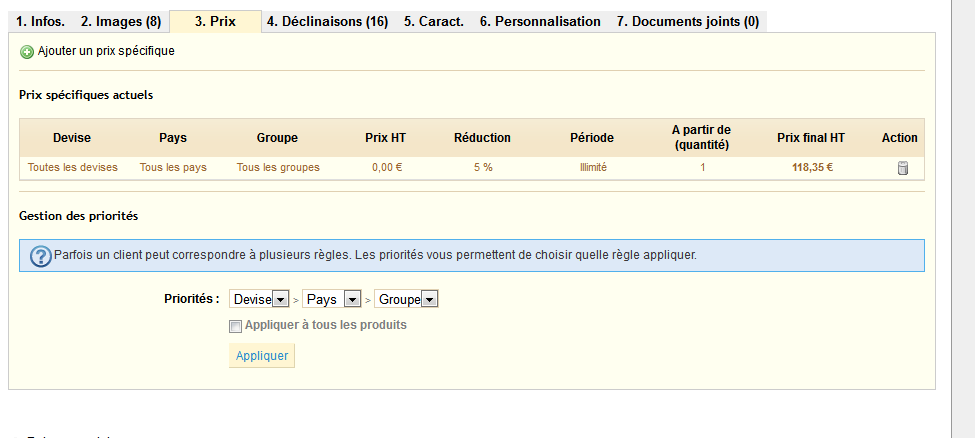 toto77 Posted May 3, 2011 Author Share Posted May 3, 2011 Comme je l'ai dit, je teste en local...je teste sur l'article 'Ensemble Deline' qui se trouve à la page d'accueil et dans le menu ensemble. Quand je vais dans catalogue et dans produit en page d'accueil, je vais dans prix et je met 20% (moins 20%). Sur la page d'accueil il ne s'affiche pas en solde, dans la rubrique 'ensemble' il s'affiche en solde.C'est embêtant quand même...Merci beaucoup! Link to comment Share on other sites More sharing options...