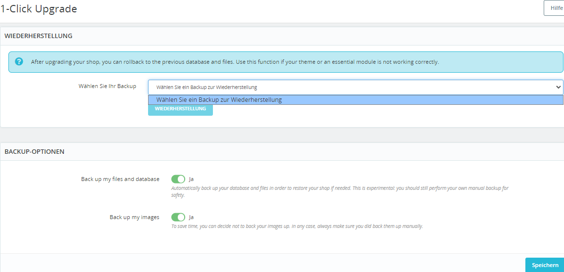 luis1 Posted February 2, 2023 Share Posted February 2, 2023 Beim Modul 1-Click Upgrade gibt es das 1 Click-Backup, was ich gestern verwendet habe um von 8.0.1 wieder auf 1.7.8.7 zu kommen. Danach wollte ich über diese Funktion ein neues Backup machen, sehe dafür aber keine Möglichkeit. Wenn man es im Dropdown-Menü auswählt, gibt es die Möglichkeit es zu löschen, was ich getan habe in der Hoffnung, danach wieder ein neues Backup erstellen zu können. Dies war nicht der Fall. Wie erstelle ich über dieses Modul ein neues Backup? Neuinstallation brachte keine Änderung. Link to comment Share on other sites More sharing options...