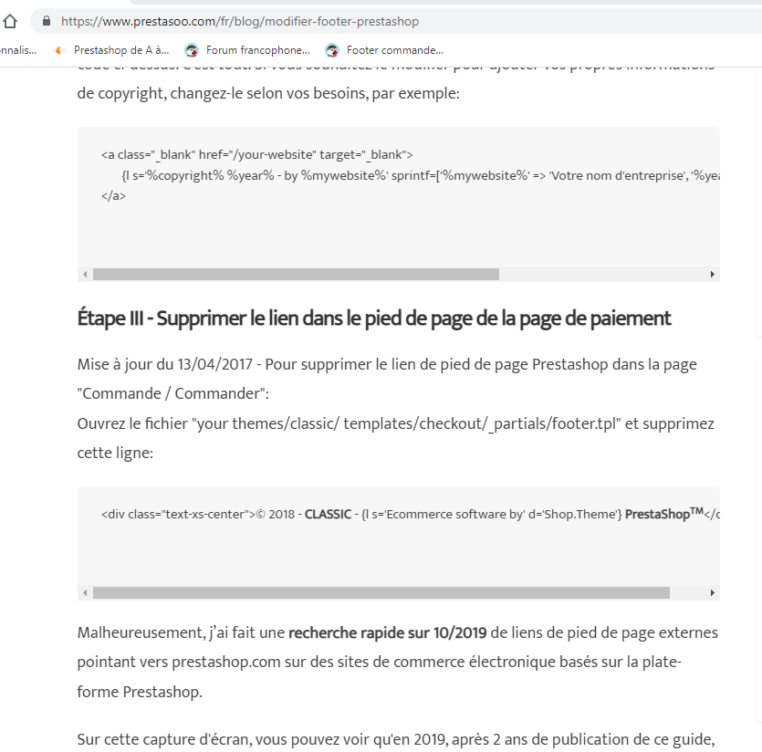 Curieux74 Posted February 4, 2023 Author Share Posted February 4, 2023 Bonjour, Résolut voici la solution ==> Pour supprimer le lien de pied de page Prestashop dans la page "Commande / Commander": Ouvrez le fichier "your themes/classic/ templates/checkout/_partials/footer.tpl" et supprimez cette ligne: <div class="text-xs-center">© 2018 - CLASSIC - {l s='Ecommerce software by' d='Shop.Theme'} PrestaShopTM</div> Source ==> https://www.prestasoo.com/fr/blog/modifier-footer-prestashop Etape => 3 voir image Link to comment Share on other sites More sharing options...
