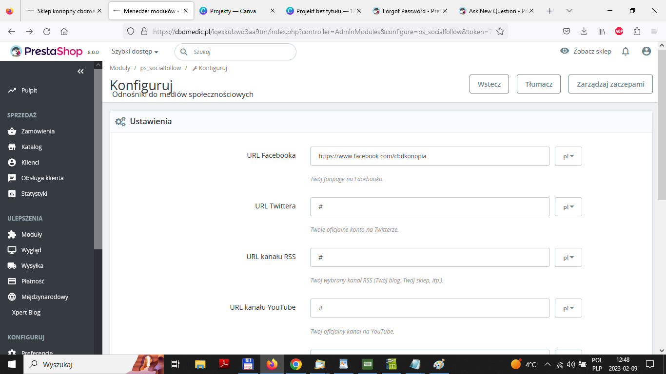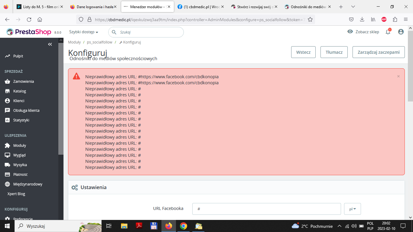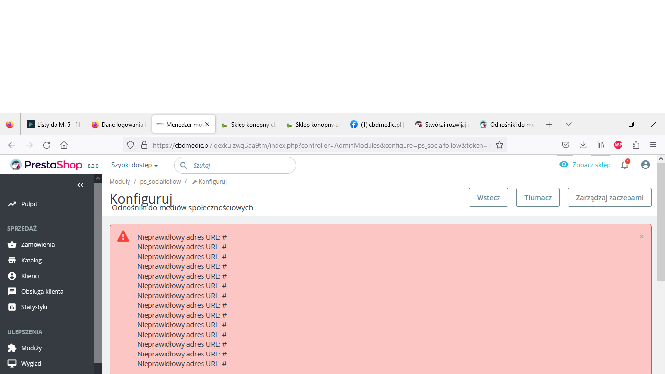 spool1234 Posted February 9, 2023 Share Posted February 9, 2023 Mam problem w preście 8.0 , w module "Odnośniki do mediów społecznościowych" po wpisaniu adresu facebook np : https://www.facebook.com/cbdkonopia po zrobieniu zapisz , Wyskakują błędy : Nieprawidłowy adres URL: #https://www.facebook.com/cbdkonopia Próbowałem z # bez # z www bez www za każdym razem to samo Bardzo proszę o pomoc Link to comment Share on other sites More sharing options...