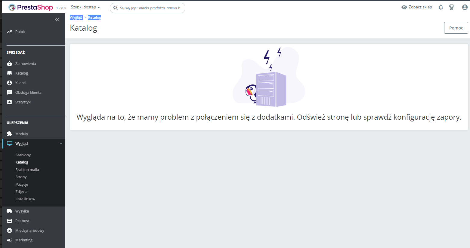 mam mały problem, po latach wróciłem do Presty i rozbiłem się o pierwszy problem. Na świeżej instalacji Presty, po kliknięciu Ulepszenia -> Wygląd -> Katalog wyświetla mi się komunikat o treści "Wygląda na to, że mamy problem z połączeniem się z dodatkami. Odśwież stronę lub sprawdź konfigurację zapory."