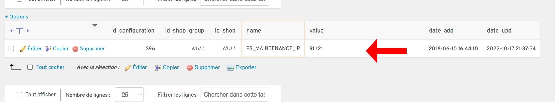 corrigerunbug Posted February 12, 2023 Share Posted February 12, 2023 (edited) You should go to your Database from your Hosting and go to table : "ps_configuration" and look for column "name" with the value : PS_MAINTENANCE_IP and from there you can remove the IP Adresse you want. Edited February 12, 2023 by corrigerunbug (see edit history) 1 Link to comment Share on other sites More sharing options...