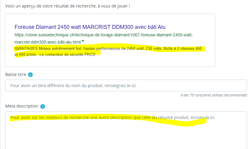 ptityop Posted February 17, 2023 Share Posted February 17, 2023 So, we have over 1000 products for al of which the meta description is generated by prestashop. The pb is that the meta descriptions do not contain main keywords which if i undertsand is better for better ranking. My question is , is it safe to not change autogenerated meta descriprions for products but copy and paste the generated one and add products keyword in them ? For example in the screenshots you will see a product named "Foreuse diamant ...", the auto generated description shows in google, what if I copy the same description but only adding the main keyword that does not show in google description ? Can this have negative effect or only positive ? In the search resuts as you will see the description comes out but I understand that it is better to have the keywords in description as well. Another option would be to modify the product descriptions only and add the keywords there ... What would you suggest ? Thanks Link to comment Share on other sites More sharing options...