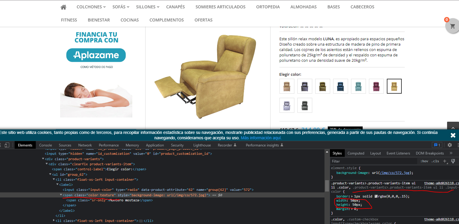 LaFabricaDeLas3B Posted February 28, 2023 Author Share Posted February 28, 2023 Tengo alguna noción. Si me indicas la ruta que tengo que seguir, puedo acceder por el wepanel y modificar el código. La web sería esta: https://www.lafabricadelas3b.es/es/inicio/231-8469-sillon-relax-luna.html#/578-luna-nelia_9 Los elementos que quiero que se vean algo más grandes son las miniaturas correspondientes a los atributos de colores. Link to comment Share on other sites More sharing options...