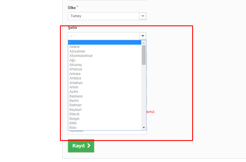 bera_ramazan Posted March 1, 2023 Share Posted March 1, 2023 Şehir kısmının adını ilçe diye çeviriden düzenleyin ilçe girsinler veya onu css den gizleyin Link to comment Share on other sites More sharing options...