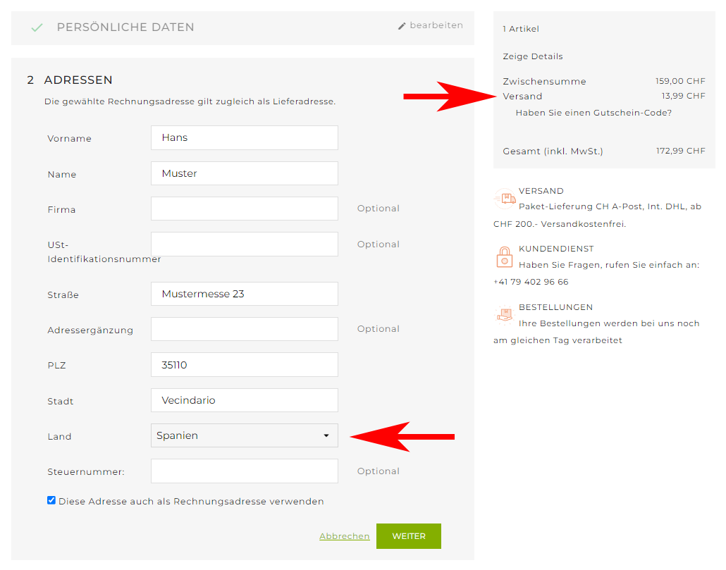 Nun habe ich den Versuch gestartet mit dem Kunden «Muster» und habe da die Adresse von «Vacindario», das sich auf der Insel «Gran Canaria» befindet eingegeben und einmal mit der Adresse von der Insel «Teneriffa». Bei beiden Versuchen wird immer das Porto vom Festland angezeigt.