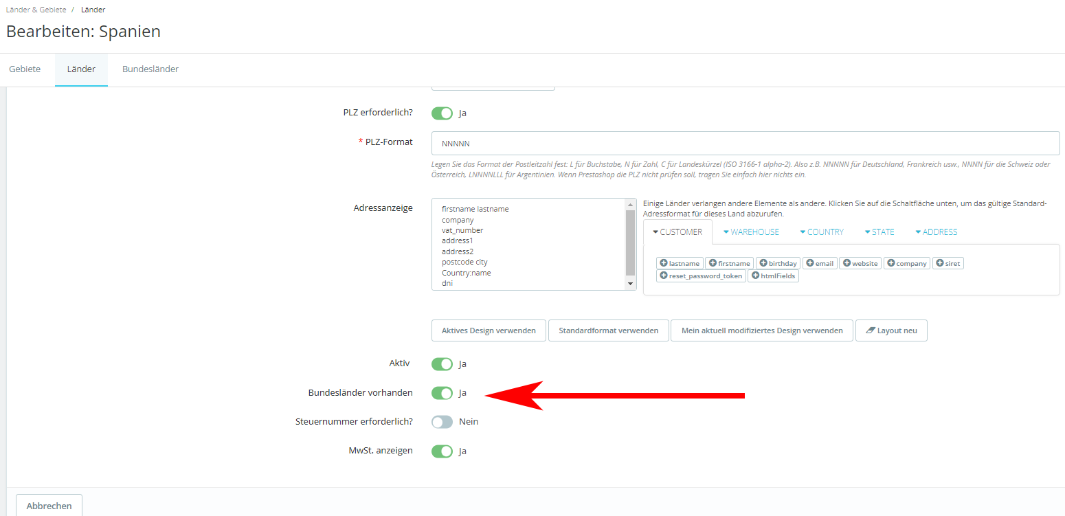 Bei den Einstellungen für einzelne Länder gibt es einen Schalter für Bundesländer und dann mußt du das Adressformat um "Bundesland" ergänzen.