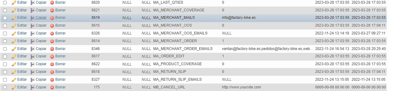 FactoryBike Posted March 28, 2023 Author Share Posted March 28, 2023 10 minutes ago, ExpertoPrestaShop said: Es correcto. Ahora busca en tu BD, la tabla configuración, busca por el campo name los que tengan este valor "MA_MERCHANT_MAILS" y envía una captura de todos los resultados que te aparezcan. Ahora tuve que salir, luego reviso y edito y te comento. Muchiiiiiisimas gracias. Link to comment Share on other sites More sharing options...