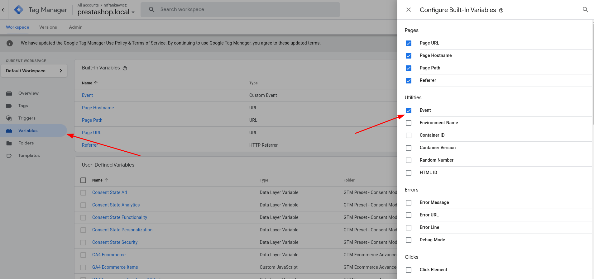 Tag Concierge Posted August 12, 2024 Author Share Posted August 12, 2024 On 8/8/2024 at 8:32 PM, kamppa said: Hello, Purchased the module and it seems to be great. However I am trying to save Google Tag workspace and get the following error: Location: GA4 Ecommerce Value for Remarketing Unknown variable "Event" found in another variable. Edit the variable and remove the reference to the unknown variable. Also do I need to do any changes to any of the tags? For example do I need to replace {{GA4 Measurement ID}} with actual ID inside GA4 Configuration Tag? Hello @kamppa, thank you for your feedback. Please enable built-in GTM variable named "Event". You can do it here: Regarding GA4 Measurement ID - yes, you should place there your real GA4 ID from settings. Here you can find example how to do it - https://docs.tagconcierge.com/article/27-how-to-import-any-gtm-preset. 1 Link to comment Share on other sites More sharing options...