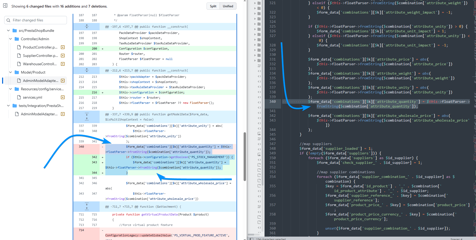 karloskast Posted April 21, 2023 Author Share Posted April 21, 2023 (edited) hace 16 horas, ExpertoPrestaShop dijo: Hay un commit de hace 3 semanas en el archivo que te lanza el error precisamente con el atributo del problema: https://github.com/PrestaShop/PrestaShop/commit/ef02676bc5819bf3704c87c33ab179e8f616c29c#diff-384120a8ec7dc16b6ad27d4125d84ddc4be632dcc3979a1a65ae19db5088a37c No se realmente si este fix está incluido o no en la version que tienes de PS, pero podrias comparar los archivos e intentar aplicarlos los cambios a ver si te soluciona el problema. Suerte Hola ExpertoPestaShop Parece ser que tienes razón, al activar la gestión de Stock el error no se produce, solo se produce cuando la gestión de Stock esta desactivada, la diferencia que veo en el código es la siguiente, voy a añadir esto y termino de confirmar. Gracias por vuestra ayuda Edited April 21, 2023 by karloskast para eliminar una de las imágenes (see edit history) Link to comment Share on other sites More sharing options...