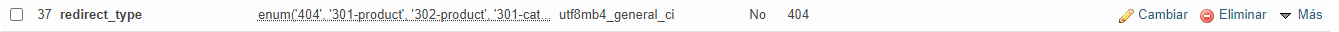 marketing_sedovin Posted April 28, 2023 Author Share Posted April 28, 2023 Muchas gracias por responder tan rápido, he localizado la tabla y el campo, adjunto captura, entiendo que donde pone 404 tendría que poner la redirección que quiera para todos los productos desactivados?? Muchas gracias. Un saludo. Link to comment Share on other sites More sharing options...