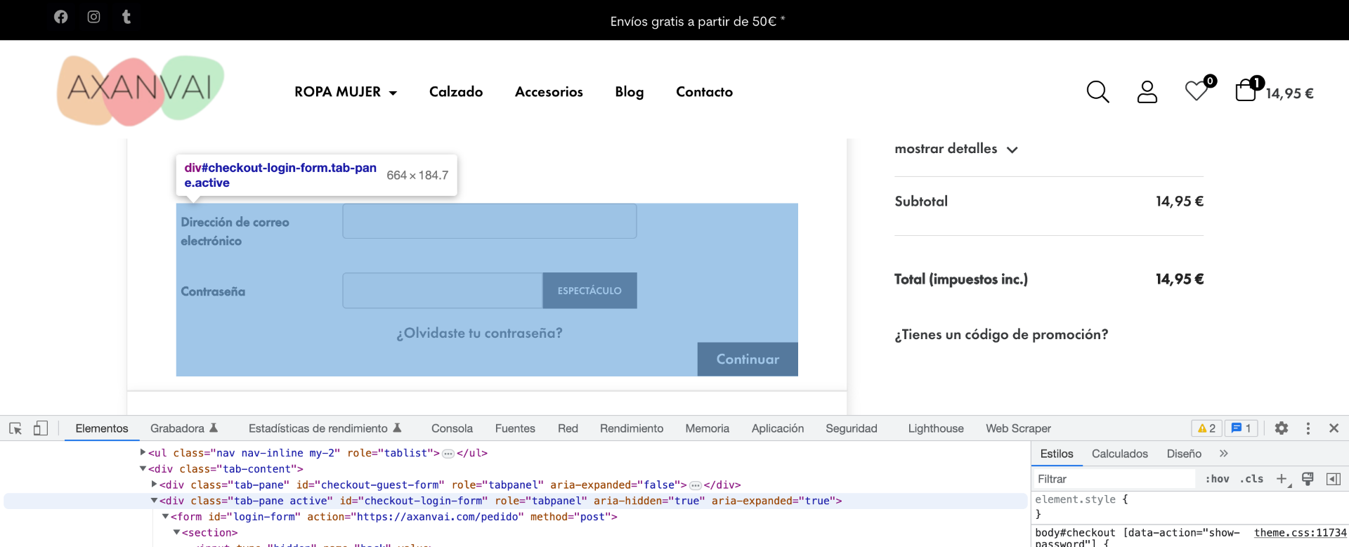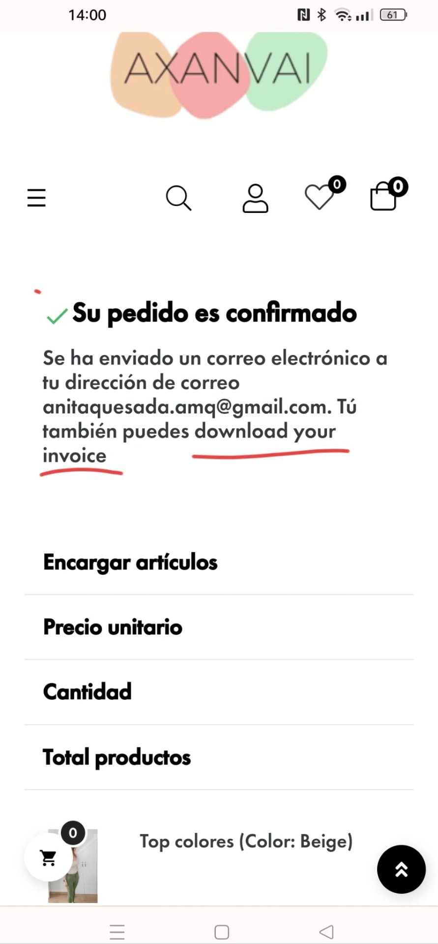 Josesol Posted May 23, 2023 Share Posted May 23, 2023 Hola, existen dos campos que están mal traducidos en la tienda y no se como encontrarlos dentro del apartado de traducciones: Os indico la URL de la tienda: https://axanvai.com/ Podéis ver el problema al añadir un artículo y entrar en https://axanvai.com/pedido sin estar registrado. Debería de estar escrito "MOSTRAR" en vez de "ESPECTÁCULO": Por otro lado también en la finalización del pedido, se encuentra este otro campo que aparece en inglés, tampoco encuentro desde donde puedo traducir "download your invoice". Agradecería mucho vuestra ayuda, gracias. Link to comment Share on other sites More sharing options...