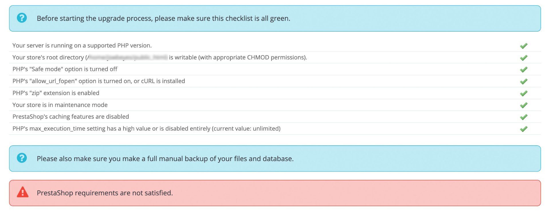 Brighteyes Posted June 28, 2023 Share Posted June 28, 2023 All the ticks are green but Prestashop is still not satisfied? Any ideas how to upgrade here? I've reset and reinstalled the 1 click upgrade module which doesn't work. This is when trying to upgrade from PS8.0.3 to 8.0.4 Link to comment Share on other sites More sharing options...