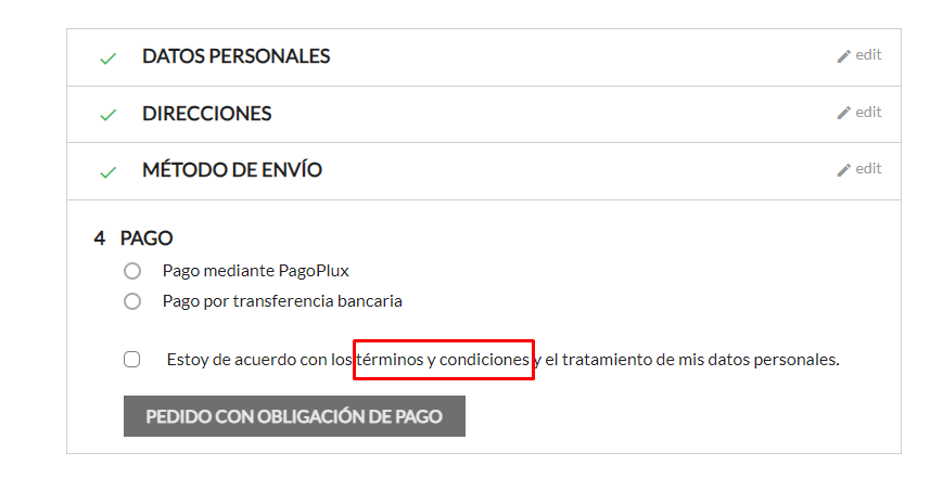 diego.jimenez Posted June 28, 2023 Share Posted June 28, 2023 (edited) Hola, buenos días, Quiero cambiar la URL del check de términos y condiciones a la hora de realizar una compra. He intentado cambiar el contenido por medio de "páginas" pero al parecer no sirve. cuando le doy clic en el botón del check, no me aparece nada. (Adjunto imagen). Muchas gracias de antemano. Edited July 5, 2023 by diego.jimenez (see edit history) Link to comment Share on other sites More sharing options...