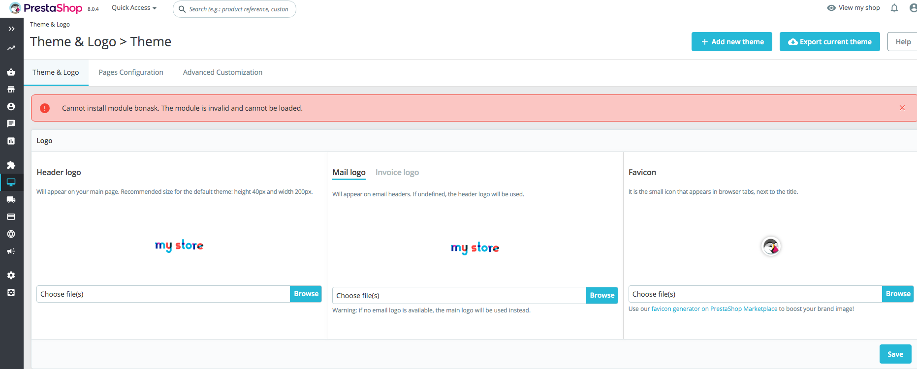 MilenaCookie Posted July 3, 2023 Share Posted July 3, 2023 Hello, I'm new to prestashop, I'm trying to change the theme but unfortunately I can't, I don't understand where the problem is, as I try to activate the theme this text appears in red "Cannot install module bonask. The module is invalid and cannot be loaded ." Do you have any suggestion about it? Thank you Link to comment Share on other sites More sharing options...